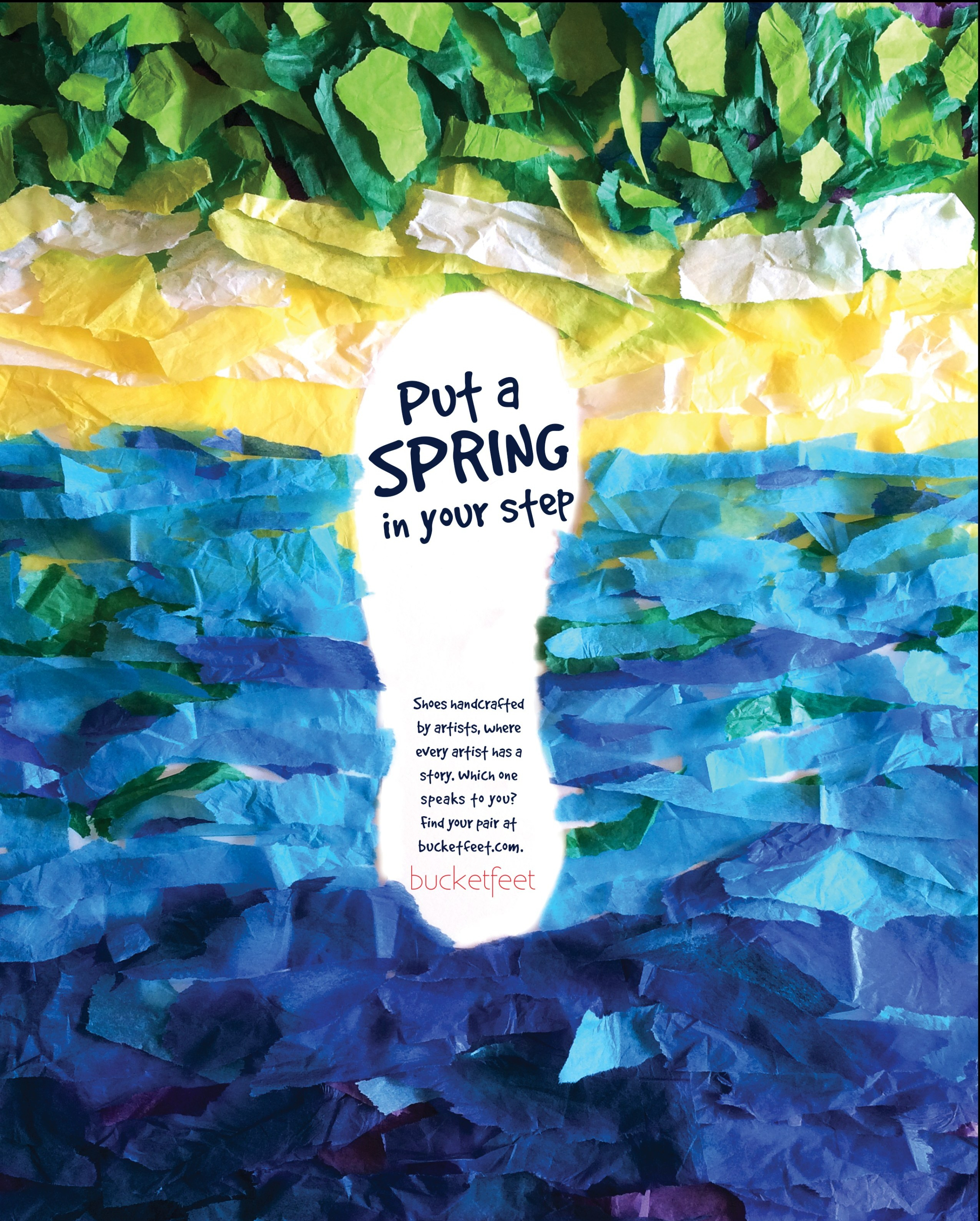 The print ads would feature a blank area where there is a shoe print with the copy and logo inside. The outside area would be the artistic area. This area would highlight the different artist styles that are at Bucketfeet. The other ads would have the same general idea in layout, but the area around the show would highlight a completely different artist and style.